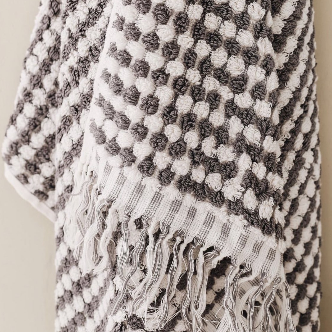 Главная особенность полотенец Payas – текстурированная махра. Петли разной высоты создают приятную мохнатую фактуру полотенец. Края завершает бахрома с длинными кистями.
