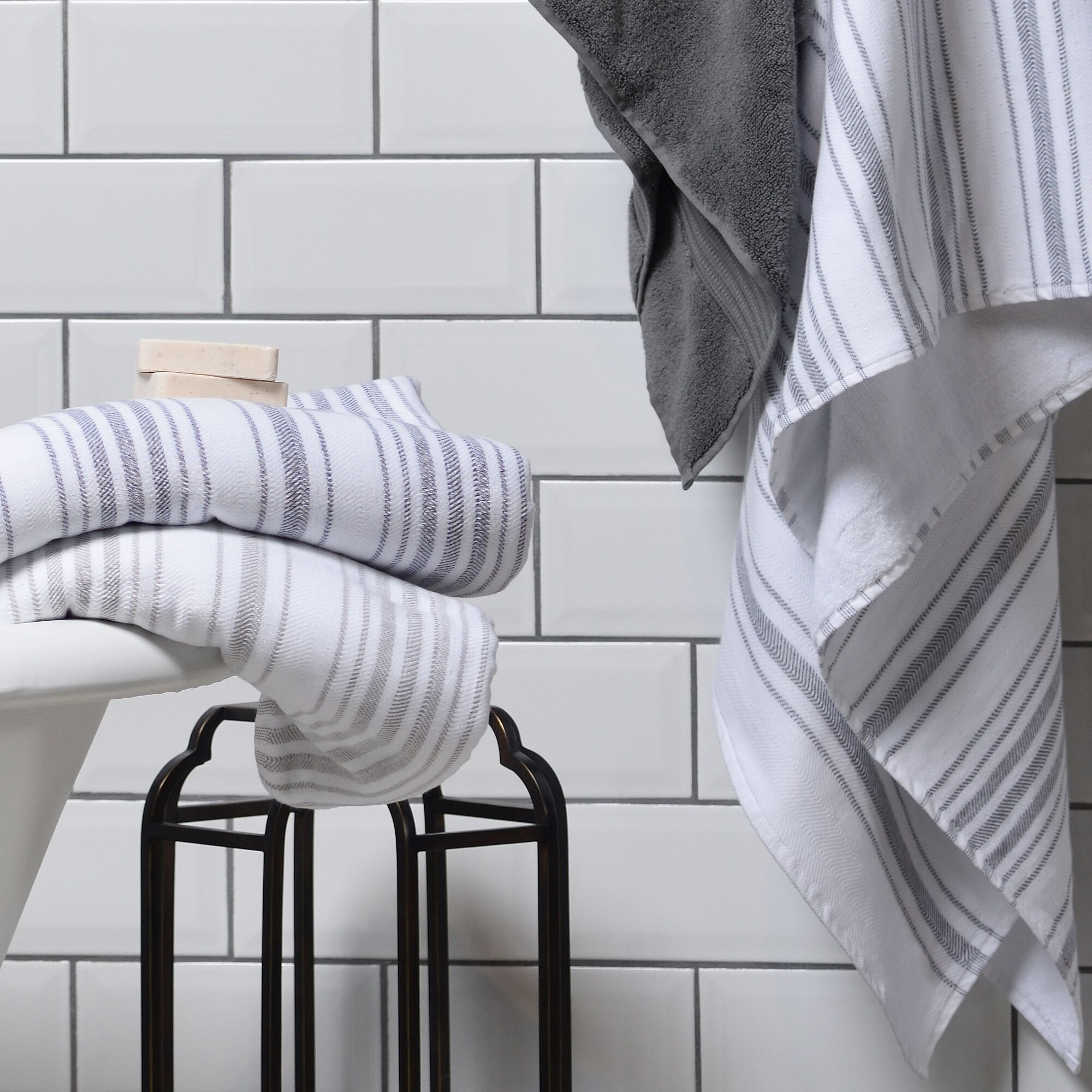 Лицевая сторона полотенец - гладкотканая, украшена лаконичной полоской, напоминает традиционное турецкое полотенце для хамама пештемаль. Обратная сторона выполнена из махры с классической петлей, плотность - 420 г/кв.м.