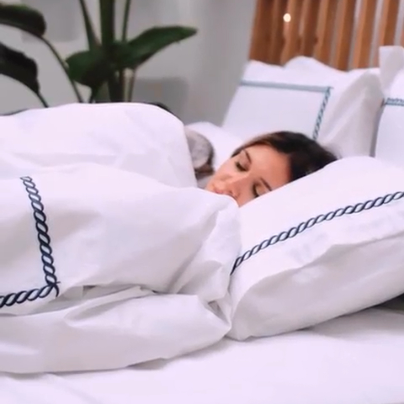 Наволочки выполнены в дизайне Оксфорд, по периметру декорированы ушками. Лицевая сторона изделий украшена изящной прямоугольной вышивкой Косами контрастного оттенка. Закрываются методом запаха. В линейке постельного белья Messina Marine представлены наволочки, пододеяльники и простыни.