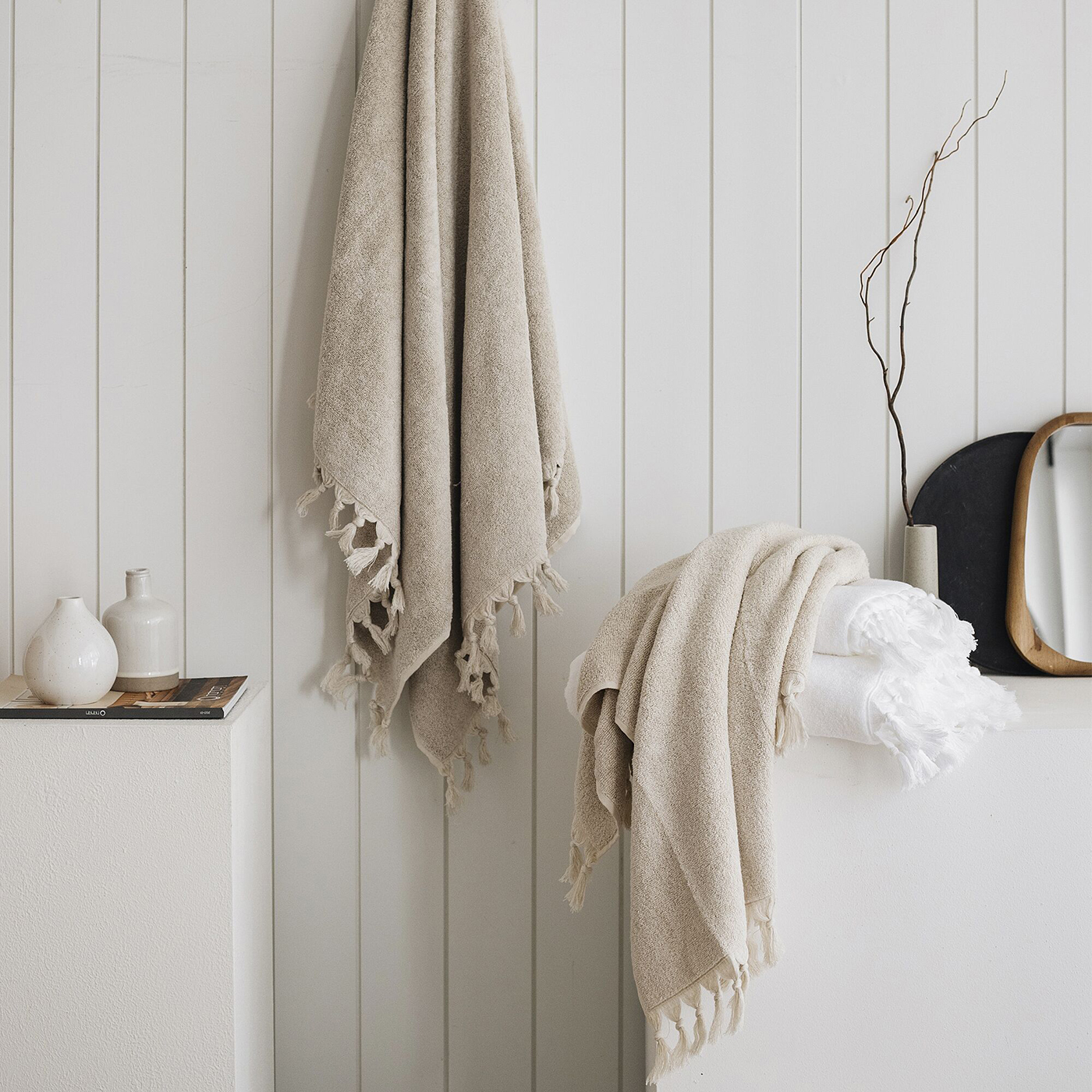 Полотенце Tierra отличается утонченной элегантностью и украшено кисточками по коротким сторонам изделия в тон, что придает ему вневременную и изысканную эстетику. Оно доступно в трех размерах для рук и тела, а также в двух сдержанных натуральных цветах, что делает его идеальным выбором для минималистичных и стильных ванных комнат.