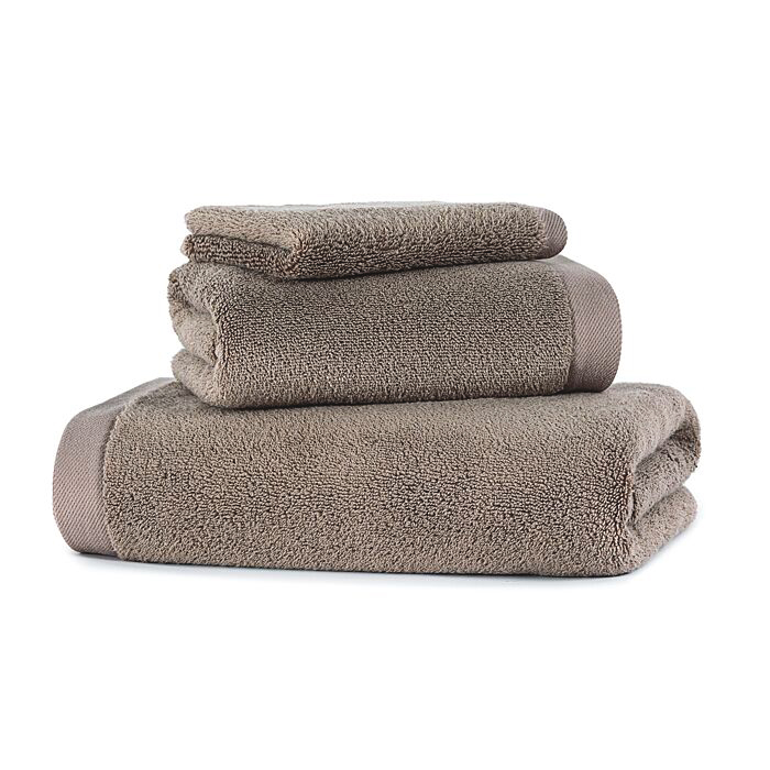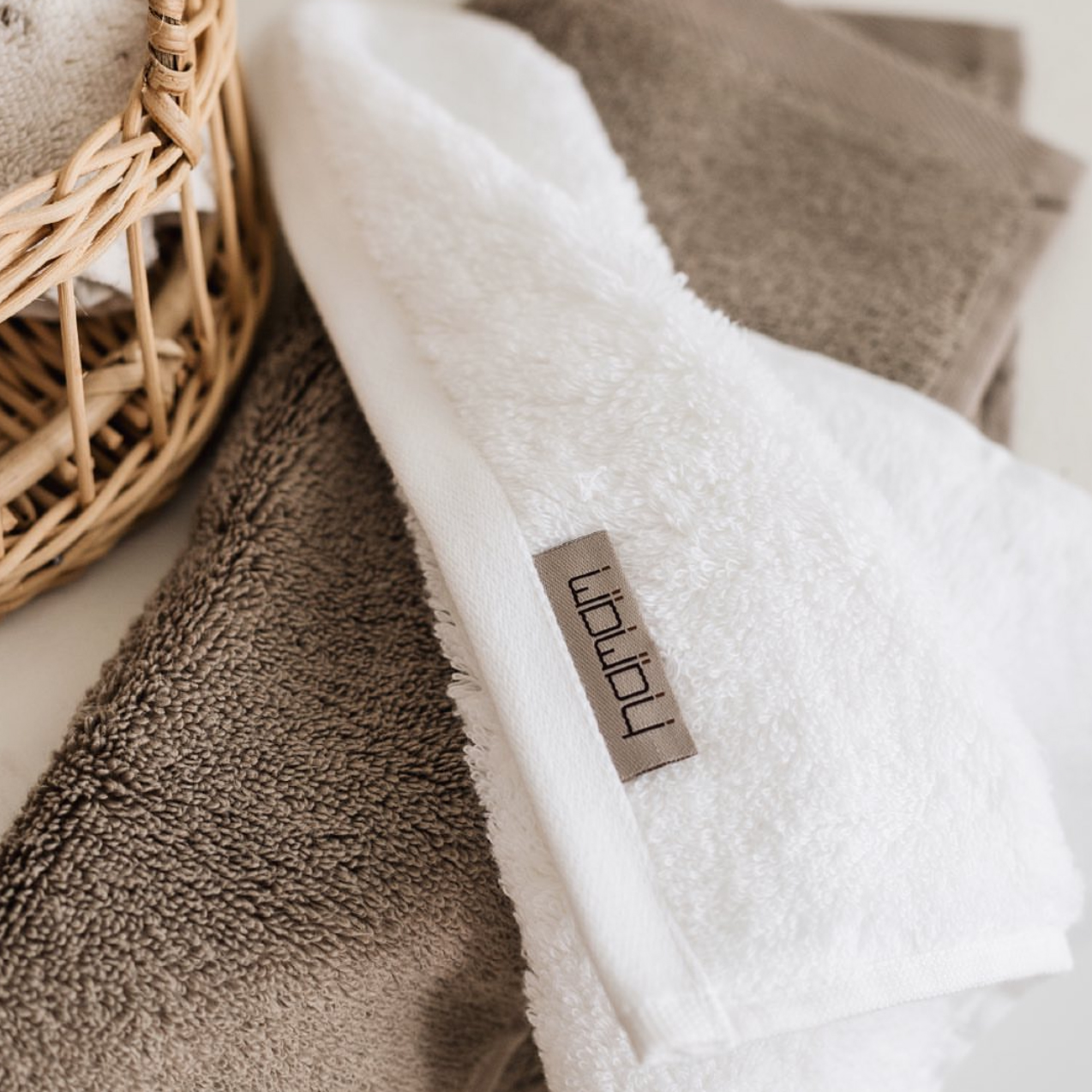 Это полотенце, доступное в четырёх размерах для лица, рук и тела, сочетает в себе белые и землистые оттенки с естественным блеском шёлка, что делает его элегантным и полезным дополнением к ежедневным процедурам в ванной.