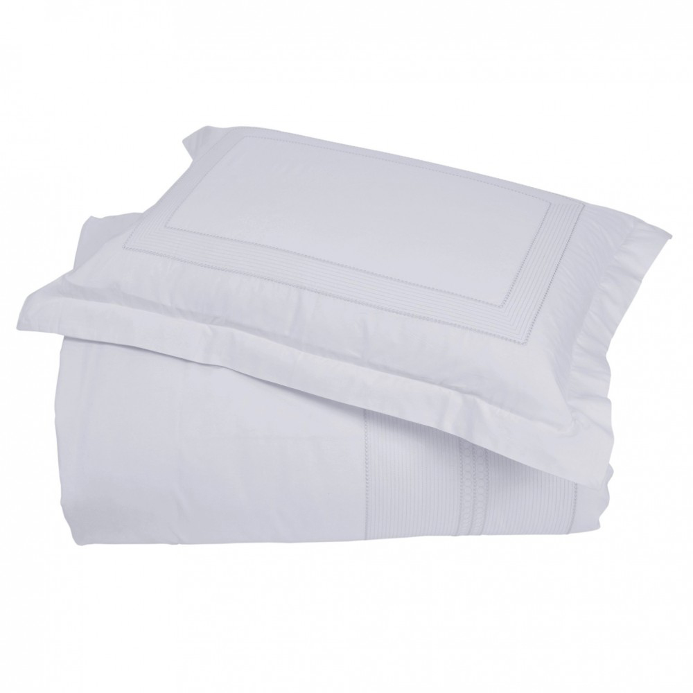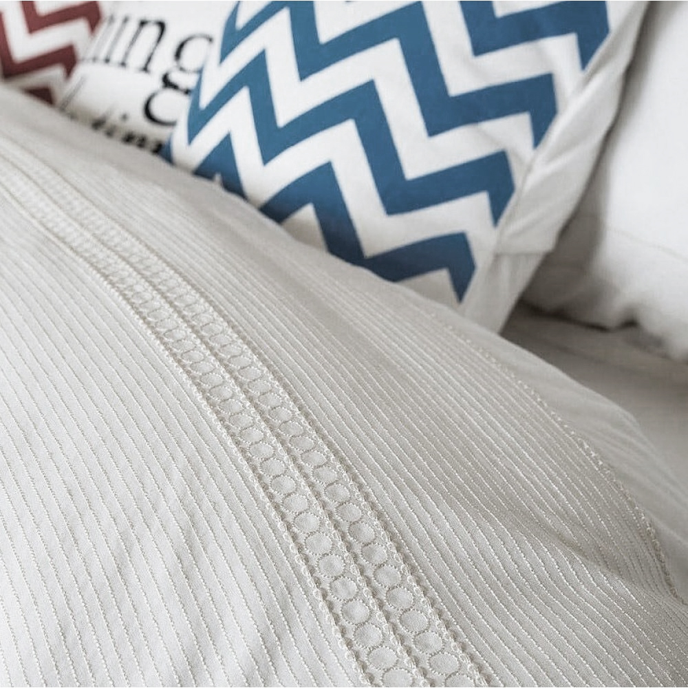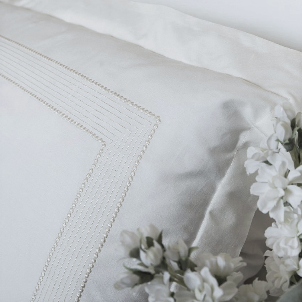 Базовые наволочки выполнены в классическом дизайне из однотонной белой ткани. Декоративные наволочки - в дизайне Оксфорд, по периметру декорированы ушками шириной 5 см. Пододеяльник и декоративные наволочки выполнены украшены изысканной вышивкой. Вход в пододеяльник внизу на скрытых пуговицах. Наволочки закрываются методом запаха. Простынь свободная (прямая).