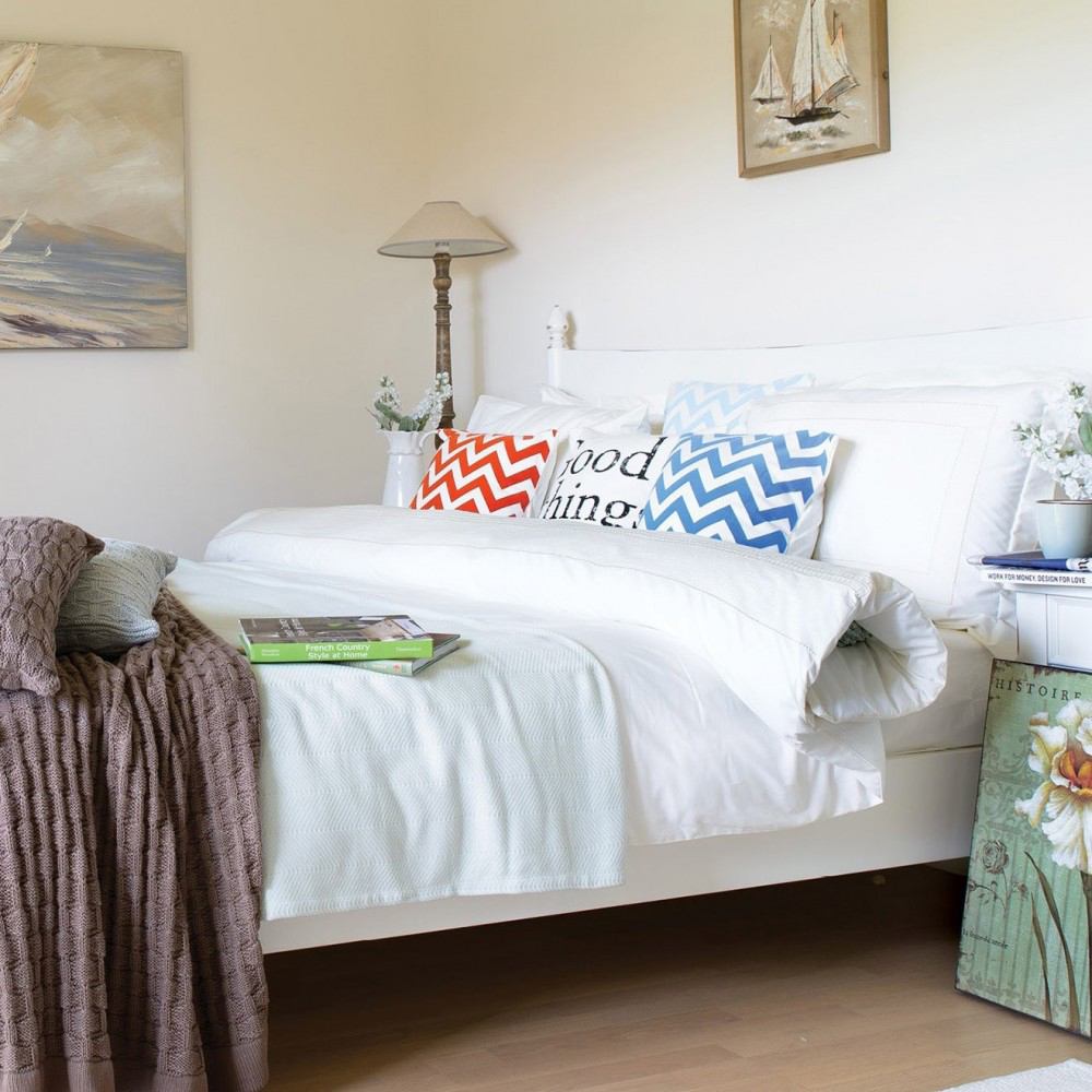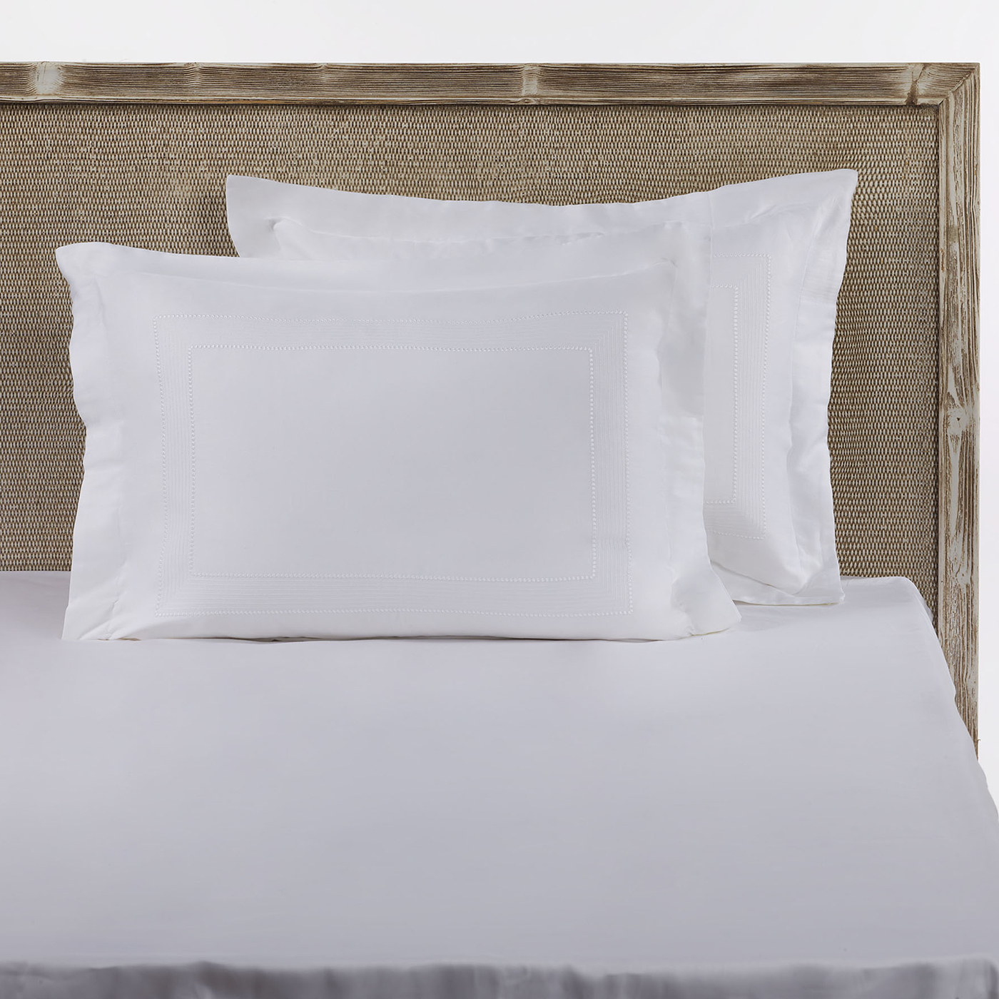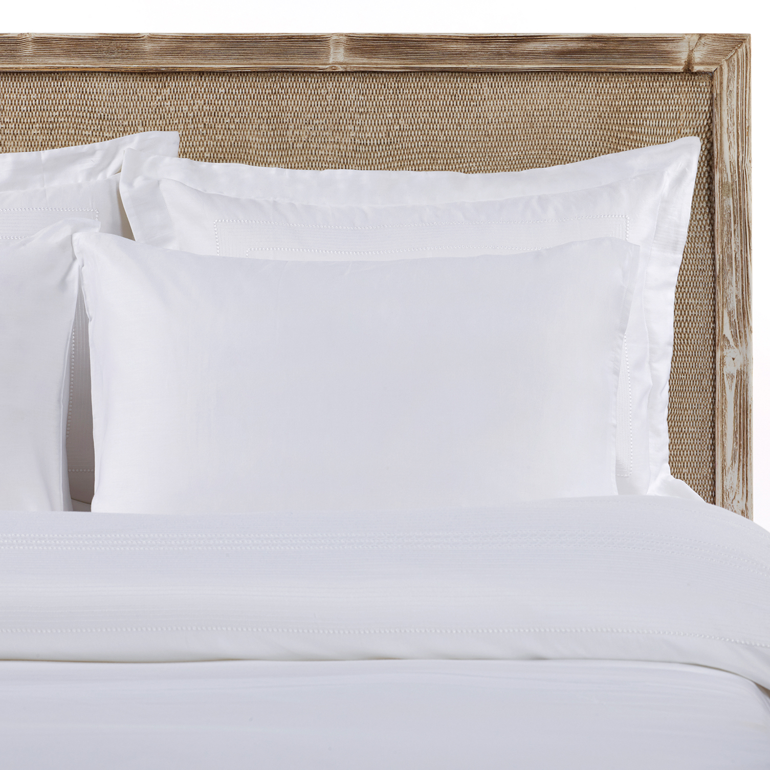 Базовые наволочки выполнены в классическом дизайне из однотонной белой ткани. Декоративные наволочки - в дизайне Оксфорд, по периметру декорированы ушками шириной 5 см. Пододеяльник и декоративные наволочки выполнены украшены изысканной вышивкой. Вход в пододеяльник внизу на скрытых пуговицах. Наволочки закрываются методом запаха. Простынь свободная (прямая).